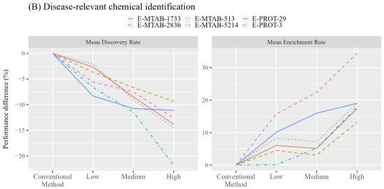A total of 3935 chemicals annotated to be associated with the diseases of the 10 tissues were analyzed by conventional and augmented methods. Figure 3A shows the average discovery and enrichment rates for the evaluated chemicals. Detailed performance for each tissue is available in Figures S1–S6. As expected, the average discovery rate was decreased in all evaluated tissues when excluding the low-expression genes. Liver is the only tissue with only a minor decreased discovery rate (−7.29%), where the filtering of low-expression genes is beneficial with 4.38%, 4.30%, 1.47%, and 0.59% improvement on the discovery rate for RNA-seq datasets of E-MTAB-1733, E-MTAB-2836, E-MTAB-513, and E-MTAB-5214 but not for proteomics datasets. In contrast, a large improvement in the average enrichment rate was obtained by filtering out low-expression genes for six tissues of bone marrow, brain, heart, kidney, liver, and skin with 5.75%, 6.68%, 6.84%, 6.46%, 13.33%, and 8.62% improvement, respectively. The filtering using all datasets provided an improved enrichment rate except for E-MTAB-5214, where improvement was observed only for the liver. The improvement in enrichment rate increases when applying a stringent filtering threshold, as shown in Figure 3A.