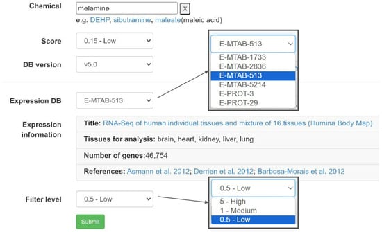 The user interface of ChemDIS with augmented functions for incorporating tissue-specific expression data. Users can select the expression dataset (E-MTAB-513 [,,] in this example) and filter level for analysis.
