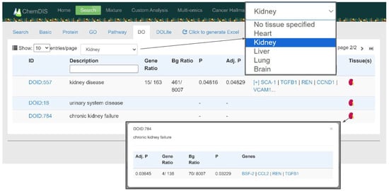 Figure 5 shows an example of the analysis results of melamine. In the disease ontology (DO) tab, the original layout of the ChemDIS system was kept with enriched DO term ID, description, gene ratio, background ratio, p-value, adjusted p-value, and interacting genes belonging to the DO term. Two new items of a dropdown menu were for showing only the DO terms associated with specified tissue expression data and a new column showing the results of the incorporation of tissue-specific expression data, respectively. As a default, there will be no tissue specified in the filtering dropdown menu, and all results will be shown in the table. A color icon and gray icon of a tissue indicate enrichment and no enrichment by incorporating tissue-specific expression data, respectively. By clicking the kidney icon with color, the enrichment analysis results will pop up showing the p-value, adjusted p-value, gene ratio, background ratio, and involved genes. In this case, the urinary system disease and chronic kidney failure were not enriched in the original ChemDIS system but were enriched by filtering out low-expression genes, which will be further discussed in the next section.