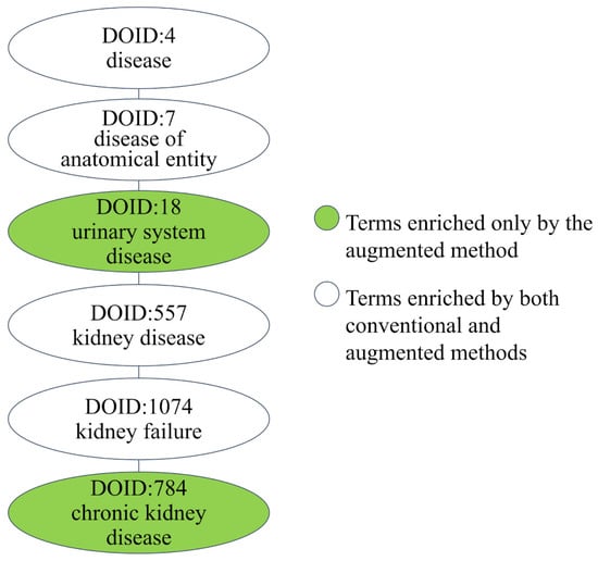 A total of 316 interacting proteins of melamine were identified in the conventional method using the STITCH v5 database. In comparison, the application of the low-expression filter using brain expression data from E-MTAB-5 and E-ROPT-29 resulted in 262 and 241 interacting proteins included in the augmented analysis, respectively. As for the kidney, a total of 257, 259, 254, 280, and 239 interacting proteins for E-MTAB-1733, E-MTAB-2836, E-MTAB-513, E-PROT-3, and E-PROT-29 were included in the augmented analysis by removing low-expression genes. Figure 6 shows the hierarchy of chronic kidney failure inferred by the conventional method and augmented method using the low-expression filter of E-MTAB-513, where the conventional method inferred only partial nodes of the hierarchy, but the augmented method inferred the complete hierarchy. Both methods are able to infer the high-level DO terms, but the more specific term of chronic kidney failure was only inferred by the augmented method. The identification of chronic kidney failure (DOID: 784) is consistent with previous studies [,]. In the conventional method, 11 out of 365 (3.01%) inferred DO terms were kidney-relevant terms. In contrast, the augmented analysis based on E-MTAB-513 showed a higher percentage of DO terms relevant to the kidney (13/305 = 4.26%).