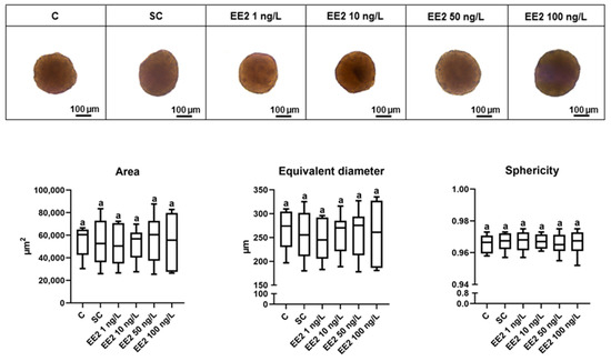 Light microscopy images, area, equivalent diameter, and sphericity of brown trout PHS (total of 6 independent fish, n = 30 spheroids per condition) after 6 days exposure (12th to 18th post-isolation day) to distinct conditions: C—control (supplemented DMEM/F-12 medium), SC—solvent control (0.1% ethanol in supplemented DMEM/F-12 medium), EE2 1 ng/L—1 ng/L of EE2 in supplemented DMEM/F-12 medium, EE2 10 ng/L—10 ng/L of EE2 in supplemented DMEM/F-12 medium, EE2 50 ng/L—50 ng/L of EE2 in supplemented DMEM/F-12 medium, and EE2 100 ng/L—100 ng/L of EE2 in supplemented DMEM/F-12 medium. Data correspond to median, minimum, maximum, 25th, and 75th percentiles. Common lower-case letters indicate no significant differences (p > 0.05) between conditions.