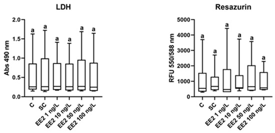 LDH and resazurin assays from brown trout PHS (total of 6 independent fish, n = 8 spheroids per condition) after 6 days of exposure (12th to 18th post-isolation day) to distinct conditions: C—control (supplemented DMEM/F-12 medium), SC—solvent control (0.1% ethanol in supplemented DMEM/F-12 medium), EE2 1 ng/L—1 ng/L of EE2 in supplemented DMEM/F-12 medium, EE2 10 ng/L—10 ng/L of EE2 in supplemented DMEM/F-12 medium, EE2 50 ng/L—50 ng/L of EE2 in supplemented DMEM/F-12 medium, and EE2 100 ng/L—100 ng/L of EE2 in supplemented DMEM/F-12 medium. Absorbance values at 490 nm and relative fluorescence units (RFU 550/588 nm) were plotted against each condition. Data correspond to median, minimum, maximum, 25th, and 75th percentiles. Common lower-case letters indicate no significant differences (p > 0.05) between conditions.