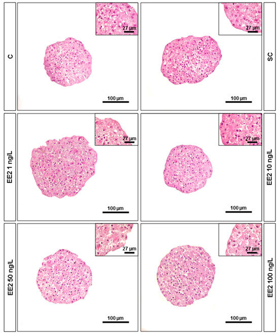 Hematoxylin and eosin (H&E) stained histological sections of brown trout PHS (total of 6 independent fish, n = 6 spheroids per condition) after 6 days exposure (12th to 18th post-isolation day) to distinct conditions. C—control (supplemented DMEM/F-12 medium); SC—solvent control (0.1% ethanol in supplemented DMEM/F-12 medium), EE2 1 ng/L—1 ng/L of EE2 in supplemented DMEM/F-12 medium, EE2 10 ng/L—10 ng/L of EE2 in supplemented DMEM/F-12 medium, EE2 50 ng/L—50 ng/L of EE2 in supplemented DMEM/F-12 medium, and EE2 100 ng/L—100 ng/L of EE2 in supplemented DMEM/F-12 medium.