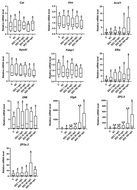 Relative mRNA levels of peroxisomal (Cat and Uox), lipid (Acsl1, ApoAI and Fabp1), and estrogen-related target (ERα, ERβ, VtgA, ZP2.5 and ZP3a.2) genes of brown trout PHS (total of 6 independent fish, n = 1 pools of spheroids per condition) after 6 days of exposure (12th to 18th post-isolation day) to distinct conditions: C—control (supplemented DMEM/F-12 medium), SC—solvent control (0.1% ethanol in supplemented DMEM/F-12 medium), EE2 1 ng/L—1 ng/L of EE2 in supplemented DMEM/F-12 medium, EE2 10 ng/L—10 ng/L of EE2 in supplemented DMEM/F-12 medium, EE2 50 ng/L—50 ng/L of EE2 in supplemented DMEM/F-12 medium, and EE2 100 ng/L—100 ng/L of EE2 in supplemented DMEM/F-12 medium. Data correspond to median, minimum, maximum, 25th, and 75th percentiles. Conditions not showing common letters differ significantly (a vs. b, p < 0.05). Significant differences (p < 0.05) between groups are represented by different letters. Cat—catalase; Uox—urate oxidase; Acsl1—acyl-CoA long chain synthetase 1; ApoAI—apolipoprotein AI; Fabp1– fatty acid binding protein 1; ERα—estrogen receptor alpha; ERβ—estrogen receptor beta; VtgA—vitellogenin A; ZP2.5—zona pellucida glycoprotein 2.5; and ZP3a.2—zona pellucida glycoprotein 3.2.