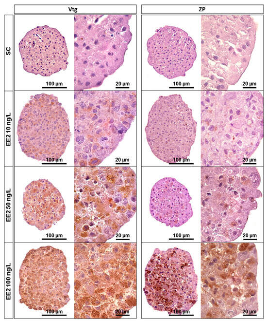 Immunohistochemistry staining for Vtg and ZP on 18-day-old spheroids from brown trout PHS after 6 days of exposure (12th to 18th day post-isolation) to distinct conditions: SC—solvent control (supplemented DMEM/F-12 medium), EE2 10 ng/L—10 ng/L of EE2 in supplemented DMEM/F-12 medium, EE2 50 ng/L—50 ng/L of EE2 in supplemented DMEM/F-12 medium, and EE2 100 ng/L—100 ng/L of EE2 in supplemented DMEM/F-12 medium. Positive immunolabelling corresponds to a brown colour signal.