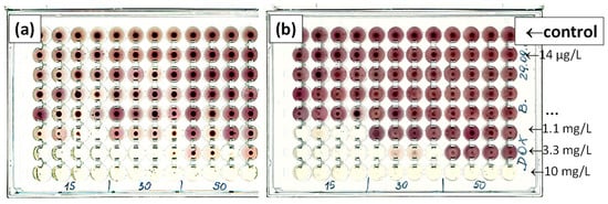 To observe the antibiotic-induced effects on the microbiocenoses studied, cultures were prepared in 96-well U-bottom test plates with tetrazolium red as a dye and with soya peptone medium. The dye was reduced in the mitochondria of living cells to deep-red, water-insoluble formazan. The resulting product accumulated at the bottom of the test plate wells. Formazan quantity was directly proportional to the metabolic activity of the microorganisms, and corresponded to the pellet size observed on the test plate. Figure 1 shows exemplary scans of the test plates with a concentration gradient of doxycycline (DOX) and inoculated with water samples (15, 30 or 50 µL) from Przemsza River (Figure 1a) or Brynica River (Figure 1b). The medium in the lowest row of test plates contained DOX with a maximum concentration of 10 mg/L. In each subsequent higher row, antibiotic concentrations were three times lower. The control row contained the medium without antibiotics. Detailed information on test plate preparation and incubation is described in Section 3.3. The presented procedure provides a method for assessing the chronic effect of antibiotics on microorganisms in the inoculum.