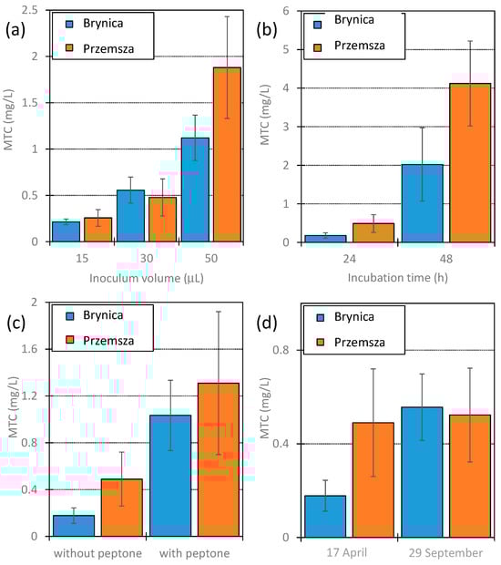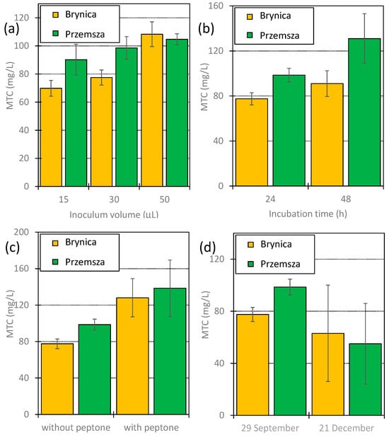 MTC values determined for TYL using inoculum from Brynica River and Przemsza River. (a) Effect of inoculum volume—incubation duration: 24 h; collection date: 29 September (b) Effect of incubation duration—inoculum volume: 30 µL; collection date: 29 September (c) Effect caused by peptone addition (50 mg/L) to inoculum and incubation for 24 h before inoculation—inoculum volume: 30 µL; incubation duration 24 h; collection date: 29 September (d) Effect caused by differences in inoculum collection date—inoculum volume: 30 µL; incubation duration: 24 h.