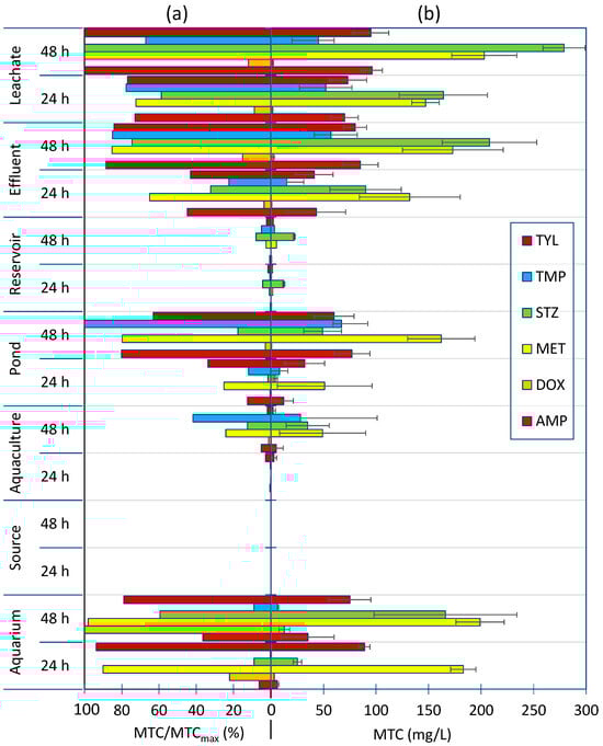 It is undeniable that the effluent and leachate microbiocenoses were exposed to antibiotics. This is supported by the resulting data. The MTC values for the antibiotics studied (excluding DOX) incubated with effluent and leachate already achieved high values after 24 h of incubation. Moreover, for leachate incubated for 48 h in the presence of AMP, MET, STZ, and TYL, the highest MTC values were compared with those from the other experiments (Figure 4b).
