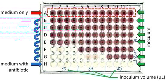 Under aseptic conditions, 150 µL of medium with antibiotic (M1) was added to each well of row H of the sterile test plates (Figure 5) using a 12-channel automatic pipette (Transferpette®—12 electronic, Brand GmbH, Wertheim, Germany). In the wells of rows A–G, 100 µL of antibiotic-free medium (M2) was added. Then, 50 µL of M1 was transferred from the wells in row H to the corresponding wells in row G, and the contents were mixed thoroughly. Proceeding similarly, 50 µL of the contents of the wells of row G were transferred to row F and mixed. The procedure was repeated up to row B, thus obtaining a dilution gradient of antibiotics with a step of 3. To maintain the same volume of solutions in all wells, 50 µL of solution was taken from the wells in row B and discarded. The medium without antibiotics was placed in the wells of row A. This row was a control for microbial growth. The test plate was then inoculated with water samples measuring 15 µL, 30 µL, and 50 µL. The prepared test plates were incubated for 48 h at 30 °C. After 24 and 48 h of incubation, the test plates were scanned (HP Scanjet G4050).