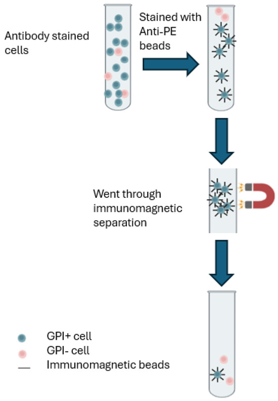 Lyophilized anti-PE microbeads were used for cell separation. Cells were stained with PE-conjugated antibody before separation and the procedure is shown in Figure 1. Then, 1 × 106 cells were centrifuged, resuspended in 80 µL PBS buffer, and mixed with 20 µL of anti-PE microbeads. After being incubated at 4 °C for 15 min, cells were washed with 1 mL PBS buffer and resuspended in 500 µL of PBS buffer. An LS column was placed on the magnetic separator and pre-rinsed with 3 mL PBS buffer before separation. Then, 500 µL cell suspension was applied to the column, and the column was washed three times with 3 mL of PBS buffer. The flow-through containing unlabeled cells (GPI(−) cells) was collected in a sterile 15 mL centrifuge tube. The column was then removed from the separator and 5 mL of PBS buffer was added to flush away the labeled cells. The same procedures were applied to both cell lines and each separation was repeated twice.