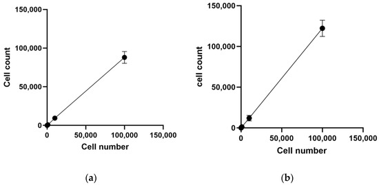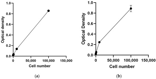 OD is supposed to be linear related to cell number; however, the linear relationship in the Hepa1c1c7 cell line, especially with a high cell density, is not as strong as in TK6 cell line. In Figure 2b, a marked decrease in the OD slope is evident after the 1 × 104 cells per well group of the Hepa1c1c7 cell line, possibly due to cell saturation. Previous studies have reported a plateau level in OD with increasing cell density, albeit with variations in concentration limits across different cell types [24]. Our experiment suggests the necessity for additional groups above 1 × 105 and between 1 × 104 and 1 × 105 per well for further research.