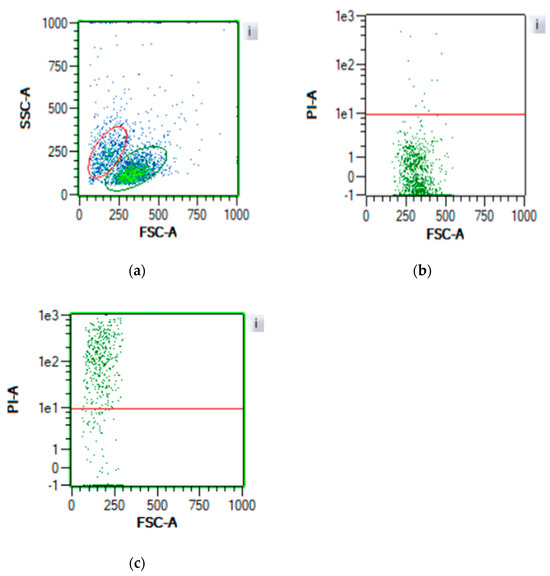 Figure 3 and Figure 4 depict the gating strategy utilized for flow cytometry analysis of cell viability. In Figure 3a, the flow cytometer identifies two distinct populations, delineated by the red and green regions. Following staining with PI, cells within the green region exhibit a low PI signal (Figure 3b), while those within the red region display a high PI signal (Figure 3c). This observation underscores the morphological changes experienced by TK6 cells post-mortem. Maintaining plasma membrane integrity is crucial for cellular viability, and PI serves as a fluorescent indicator of cell membrane permeability due to its high hydrophobicity. Although prolonged exposure to PI may induce cytotoxic effects, short-term exposure or its use as an endpoint assay is recommended [25].
