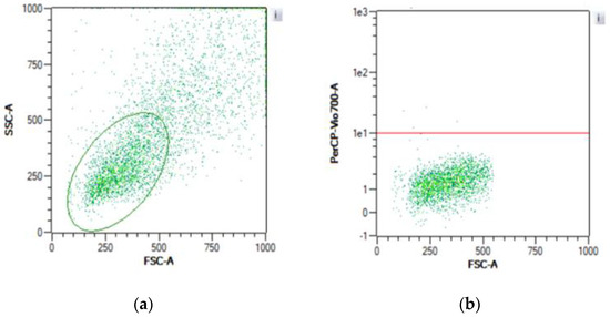 Gating strategy for Hepa1c1c7 cell line: (a) cell selection through FSC and SSC channels, which represent cell dimension; (b) live cell selection with a low PI signal. PI cannot travel through intact cell membranes and membranes of dead cells lose their integrity.