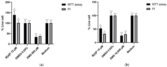 Results for the comparison of cell viability function for the MTT assay and PI: (a) cell viability result for TK6 cell line; (b) cell viability result for Hepa1c1c7 cell line. Statistical analysis was performed using one-way ANOVA followed by Tukey’s Honest Significant Difference (HSD) test. Groups marked with * are significantly different from the control group (* p < 0.05). Error bars represent the standard deviation from the mean for triplicate experiments.