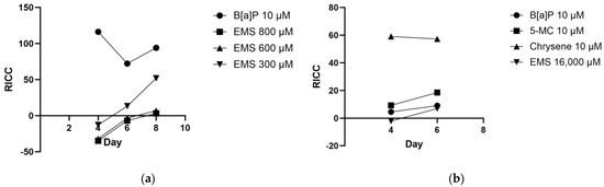 After exposure, the RICCs for EMS 800 µM (RICClow = 3.16) and 600 µM groups (RICClow = 6.74) were relatively low compared to the findings of Krüger et al. (2015) [15] with 800 µM EMS (RICClow = 10) under the same exposure period. On day 6, a significant difference in live cell numbers between the B[a]P and DMSO groups was observed on day 6. B[a]P is a procarcinogen and needs to be bioactivated by CYP450 and exposure to B[a]P induces cell apoptosis [12]. Despite the knowledge that TK6 cells cannot bioactivate B[a]P, the reason for the detected difference in live cell numbers remains unknown.