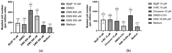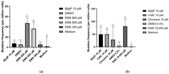 Mutation frequency for cell lines corrected for RPD: (a) TK6 cell line frequency; (b) Hepa1c1c7 cell line mutation frequency. Statistical analysis was performed using one-way ANOVA followed by Tukey’s Honest Significant Difference (HSD) test. Groups marked with * are significantly different from the control group (* p < 0.05). Error bars represent the standard deviation from the mean for triplicate experiments.