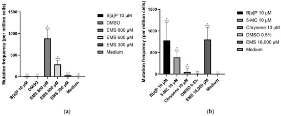 The results are presented in Figure 10. For the TK6 cell line, a 4 h exposure to 800 µM EMS increased the mutation frequency to 886 ± 201.61 per million cells per cell cycle, while exposure to 600 µM EMS over the same period raised the frequency to 285 ± 95.85 per million cells per cell cycle. Conversely, the EMS 300 µM group showed a frequency of 32 ± 15.48 per million cells per cell cycle, which was not statistically significant compared to controls. The spontaneous mutation frequency observed for the TK6 cell line in our experiment was 2 ± 19.50 per million cells per cell cycle, exhibiting significantly higher variation compared to the findings of Krüger et al. in 2015 [15] (0.76 ± 0.43 per million cells per cell cycle). Notably, no significant difference was observed between the B[a]P, DMSO, and medium control groups, indicating that as expected, B[a]P did not exhibit genetic toxicity on TK6 cells, consistent with the background knowledge that TK6 cells lack CYP450 isoforms and cannot bioactivate B[a]P to its carcinogenic form, BPDE.
