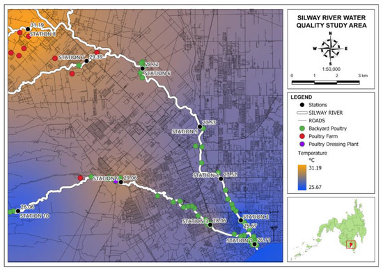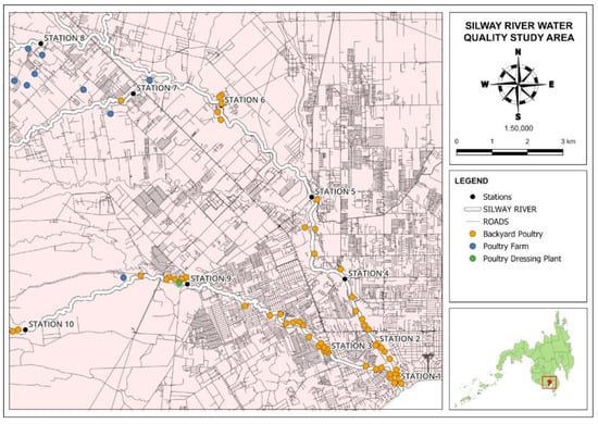A preliminary reconnaissance survey was conducted to identify the location of the sampling stations and nearby poultry farms and backyard poultries in Silway River. The initial coordinates of the stations were identified using Google Earth Pro. The selection of water sampling stations was determined based on the proximity to poultry farms and local communities engaged in backyard poultry raising and family poultry. Additionally, some stations were selected in alignment with the Silway River Water Quality Management Area (WQMA) stations. Figure 2 shows the map of the sources of chicken fecal contamination.