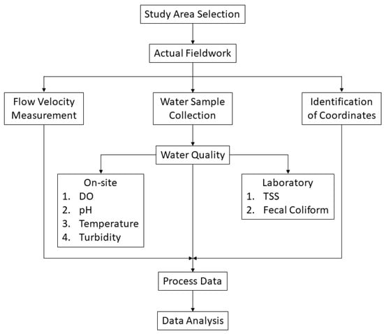 Figure 3 shows a flow chart with a brief procedural illustration of the study. Flow velocity, actual stations coordinates, water quality parameters, and water samples for laboratory tests were gathered simultaneously.