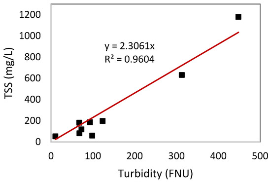 There is a positive linear relationship between turbidity and TSSs. An R2 value of 0.961 and a p-value of <0.0001 indicates a highly significant effect in the relationship between turbidity and TSSs. As turbidity levels increase, TSS levels also increase. The equation y = 2.3061x was used as the turbidity–TSS conversion equation for all the turbidity data collected on site.