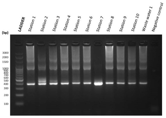 The gel image results of the first and second nested PCR of Silway River water samples from Station 1 to Station 10 and a negative control are shown in Figure 6 and Figure 7. Figure 6 shows the agarose gel electrophoresis image result of the first nested PCR of water samples from Silway River stations. On the other hand, Figure 7 shows the agarose gel electrophoresis image result of the second nested PCR of water samples from Silway River stations.
