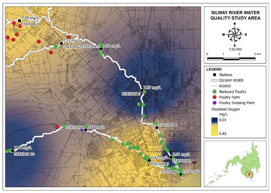 The measurement of DO is crucial for assessing the metabolic pulses of rivers and is a fundamental indicator of water quality [22]. Figure 8 shows the map for the results of DO concentration along the Silway River.
