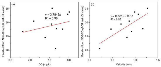 An R2 value of 0.98 indicates that higher DO has a higher Ct value, which means less chicken fecal contamination (Figure 14a). Low DO levels could indicate a higher presence of bacteria using it for respiration and an increased amount of decaying organic matter [30]. Meanwhile, an R2 value of 0.55 and a p-value of 0.01 indicate a significant effect of flow velocity on chicken fecal contamination (Figure 14b). With the availability of a current meter and DO meter, fecal coliform Ct value could be estimated using the equation Y = −6.920926245 + 3.571535586 × DO + 10.46724234 × Velocity. The equation developed is specific to the Silway River section studied on the given date, reflecting the conditions observed, and has not been validated or applied to other systems.