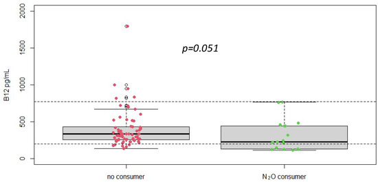 Plasma vitamin B12 concentrations according to different groups (No N2O consumer, n = 216 vs. N2O consumers, n = 19), p-value was obtained using Student t-test. Dotted line = reference range [197–771] pg/mL.