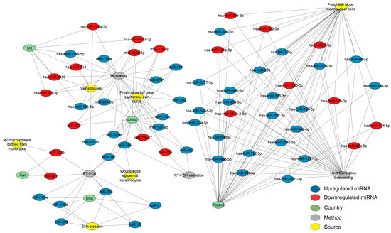 After reviewing the literature and applying the filters mentioned in the methods for bibliographical screening, we created different networks using the selected studies. Scheme 1, according to the PRISMA statement, outlines the article selection criteria for subsequent analysis. A carefully selected database of differentially expressed miRNAs in cardiovascular disease was acquired to determine the most pertinent miRNAs. A structural network analysis was built to find the common miRNAs between the countries where these studies were performed. The data for this network analysis were collected from studies where the detection methods, tissues, and expression of each miRNA were found (Figure 1). The three most outstanding sources were the proximal part of the significant saphenous vein tissue, vein tissues, and peripheral blood mononuclear cells (PBMCs). This network analysis found that Poland researched CVD-associated miRNAs most, followed by China, the UK, and the USA. The most effective methods for diagnosing CVD were microarray and RT-PCR. The analysis identified several interconnected miRNAs within the network, including miR-34a, miR-34c, miR-202-3, miR-1202, and miR-130a. The analysis detected miR-34a in wound-edge epidermal keratinocytes and the proximal part of the significant saphenous vein tissue using microarray, RT-PCR, and RT-PCR validation methods.