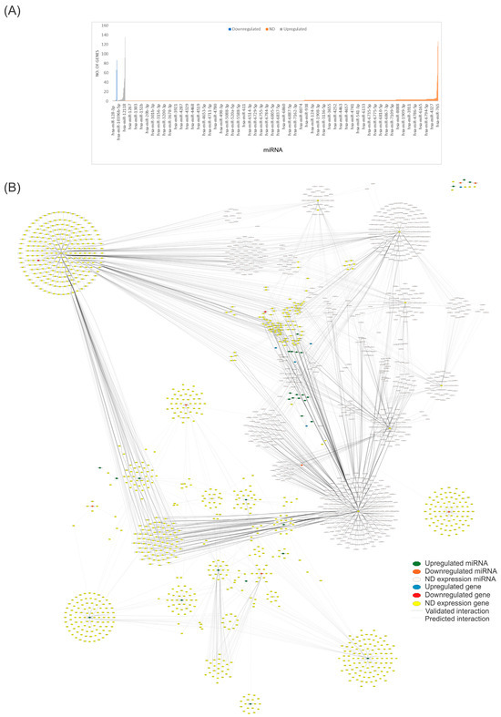 Network analysis of miRNAs associated with CVD and their predicted targets. (A) The bar plot visually presents the number of targetable genes in the miRNA curated dataset. In the plot, gray bars represent upregulated genes, blue bars denote downregulated genes, and orange bars indicate genes with undetermined expression (ND). (B) We constructed a structural network using reported and predicted interactions between miRNAs and their targeted genes. This network consists of 1882 nodes and 5267 edges, with a diameter and a network density of 12 and 0.001. The network was created using Cytoscape software (v.3.10.2). Please refer to the Supplementary Materials (Figure S2) for a better image resolution.