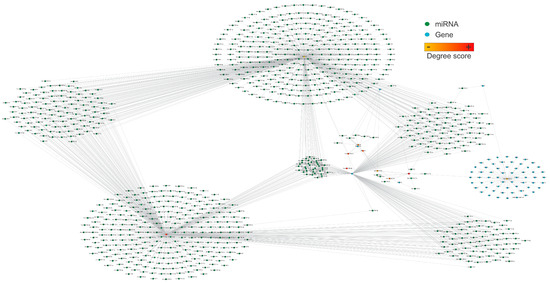 We further analyze the structural network in Figure 2, which shows the most connected nodes. The most connected genes were WNK-1, IL1RN, PPP6R2, PRRC2B, and ADIPOQ, and the most connected miRNAs were hsa-miR-106b-3p, has-miR-92a-3p, hsa-miR-454-3p, hsa-miR-548ac, and hsa-miR-128-3p (Figure 3).
