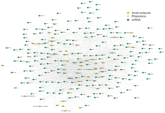 The structural network of small molecules, phlebotonic, and miRNAs. The structural network depicts the targeted miRNAs (green nodes) between small molecules (yellow nodes) and the phlebotonic hesperidin (pink node). It was observed that curcumin exhibited the highest connection of miRNAs with the reported phlebotonic hesperidin. The network involves 246 nodes and 1153 edges, with a diameter and a network density of 6 and 0.038, respectively. The network construction utilized Cytoscape software (v.3.10.2). Please refer to the Supplementary Materials (Figure S4) for a better image resolution.