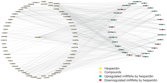 In this sense, because of the critical participation of miRNA in gene expression in the development of CVD, we focused on identifying potential miRNAs and drugs that could modulate the expression of those miRNAs and may antagonize their profile expression during CVD. To achieve this aim, we employed a network-based approach. The data were collected from both the literature and miRNA-related databases to identify, by network analysis, potential molecules that interact with miRNAs regulated by hesperidin and that modify the gene expression involved in CVD derived from miRNAs collected from several studies with potential miRNA biomarker candidates and as potential therapeutic agents [4,9,11,36,37,38,39,40].