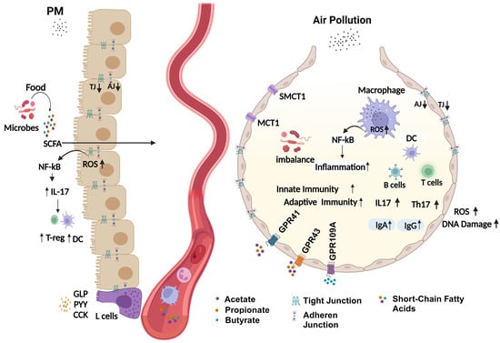 Mechanism of air-pollution-mediated microbial alteration and inflammation. In the healthy state, short-chain fatty acids maintain immune homeostasis by inducing the production of anti-inflammatory mediators and balance between immune cells. In the case of air pollution, excessive production of ROS disrupts epithelial barriers, production of pro-inflammatory mediators (IL-17), and subsequent production of IgA and IgG, and increased NF-kB activity leads to a significant shift in innate and adaptive immunity. Gut-derived altered secondary metabolite production (CCK, GLP, and PYY) and SCFA imbalance reduce barrier integrity and increase Treg and DC infiltration. Acetate, propionate, and butyrate, through binding to lung receptors, modulate lung microbiome changes. Moreover, reduced expression of MCT1 and SMCT1 (transmembrane proteins) leads to decreased diffusion, thus increasing the accumulation of inflammatory mediators.