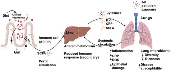 Gut–liver–lung’s axis regulation alteration by the microbiome. Factors such as diet, pollution, and antibiotics alter the gut microbiome, which produces SCFAs and other secondary metabolites. These metabolites travel through the portal vein and induce activation of macrophages and neutrophils. Induced cytokines, immune regulators, and secondary metabolites through systemic circulation regulate ROS generation, CRP production, and epithelial damage in the lungs. These also led to alterations in the diversity and richness of the lung microbiome. Microbiome change in the respiratory tract caused by air pollution also modulates the alteration of microbial balance in the gut through the lung–gut–liver axis.