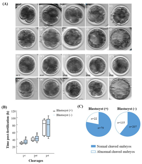 Embryo morphokinetics via the time-lapse system. (A) Representative images of a normally cleaved embryo through different developmental stages: (a) 2-cell, (b) 3-cell, (c) 4-cell, (d) 5-cell, (e) 6-cell, (f) 7-cell, (g) 8-cell, (h) morula, (i) an early blastocyst, and (j) an expanded blastocyst, and an abnormally cleaved embryo: (k,k’) a directly cleaved embryo from zygote to 3-cell, (l,l’,l’’) a reversed cleaved embryo from zygote to the 2-cell embryo and back to the 1-cell embryos, (m) a 2-cell stage embryo displaying unequally sized blastomeres, (n) a 2-cell stage embryo with large fragments, i.e., classified as having poor morphology, (o) a 4-cell stage embryo displaying unequal sized blastomeres, i.e., classified as having poor morphology, (p) an 8-cell stage embryo displaying unequally sized blastomeres, i.e., classified as having poor morphology, (q) a blastocyst exhibiting a poor morphological appearance, with loosely clustered cells at the inner cell mass and a trophoblast containing a layer of discontinuous cells. (B) Presented is the cleavage timing post-fertilization (1st, 2nd, and 3rd cleavages) of cleaved embryos that further developed (+) or did not (−) develop to the blastocyst stage [25]. The Kruskal–Wallis test, followed by the Wilcoxon test for pairwise comparisons, was used to compare the median time values of the 1st, 2nd, and 3rd divisions of embryos that either developed to blastocysts or did not. Data are presented in box and whisker plots, indicating the timing for 25, 50 (i.e., median), and 75% of the cleaved embryos. * p < 0.05. (C) Presented is the distribution of cleaved embryos classified as either with a normal or abnormal cleavage pattern among embryos that either developed (+; n = 101, the total number of embryos that developed to the blastocyst stage) or did not develop (−; n = 342, the total number of embryos that did not reach the blastocyst stage) to the blastocyst stage [25] . The chi-squared test, followed by Fisher’s exact test, was performed to compare the cleavage pattern distribution (normal or abnormal) of embryos that developed to blastocysts with those that did not.