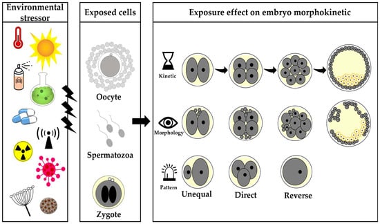 Schematic illustration of the most concerning environmental stressors that affect embryo morphokinetics. These stressors include heat stress as well as human-made chemical and naturally occurring compounds. They have been reported to affect the oocyte, spermatozoa, or zygote, which are further expressed by embryo kinetics, embryo morphology, and embryo division patterns.