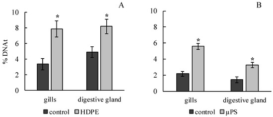 Damage of DNA molecule in cells of gills and digestive gland of M. trossulus under the influence of different types of plastic ((A) high-density polyethylene fragments; (B) polystyrene microspheres) (mean ± standard deviation; n = 15). * Difference from control is significant at p < 0.05.