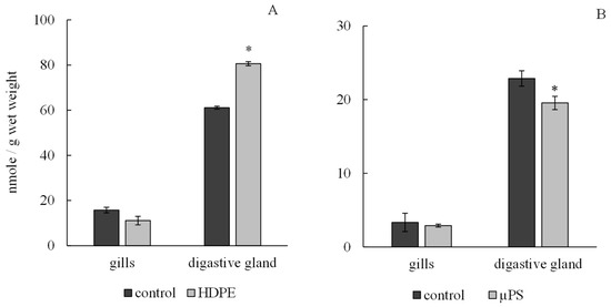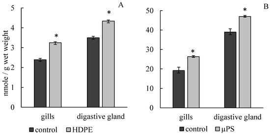 Changes in malonic dialdehyde content in cells of gills and digestive gland of M. trossulus under the influence of different types of plastic ((A) high-density polyethylene fragments; (B) polystyrene microspheres) (mean ± standard deviation; n = 10). * Difference from control is significant at p < 0.05.