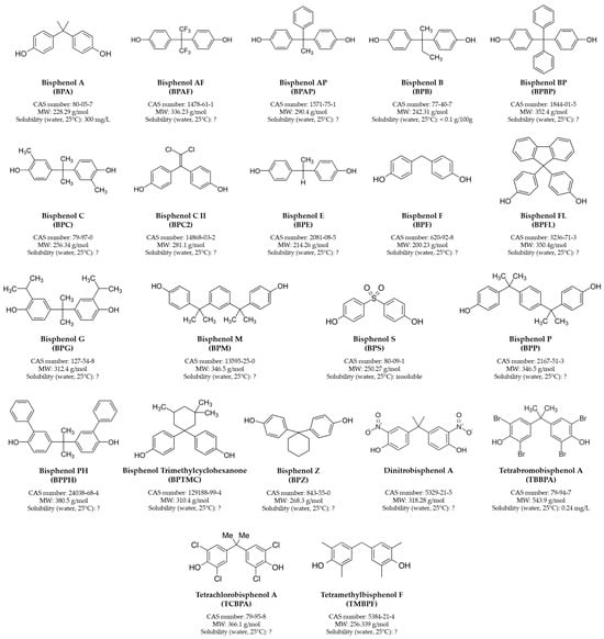 BPA and its major analogs. Reported data were retrieved from PubChem (https://pubchem.ncbi.nlm.nih.gov/, accessed on 18 October 2024). MW = molecular weight. “?” = Solubility not reported.