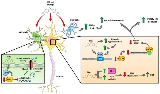 Toxicology model proposal with RACK1 as a central hub to explain bisphenol-mediated adverse effects on INEN. At the neuronal level, BPA can directly (through GRα agonism) and indirectly (through an increased GCs release due to HPA axis hyperactivation) induce RACK1 downregulation, leading to a reduced production of mature BDNF linked to anxiety-like behavior and increased neuroinflammation; in parallel, BPA-induced DJ-1’s increased expression and oxidation contribute to reducing RACK1 stabilization, leading to reduced ROS scavenging and increased oxidative stress. In the microglia, BPA stimulates the production and release of TNF-α and IL-4, contributing to and exacerbating neuroinflammation. Finally, in astrocytes, BPA could activate GRα and reduce RACK1 expression; decreased levels of RACK1, which normally contributes to downregulate Kir4.1 mRNA, lead to an increased Kir4.1 expression, resulting in enhanced K+ currents and altered neuronal activity (see text for details).