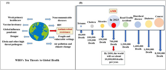 (A) WHO’s ten threats that burden human health with highlighted antibiotic resistance. (B) The number of antimicrobial-resistance-related deaths occurring annually compared to other leading causes of death.