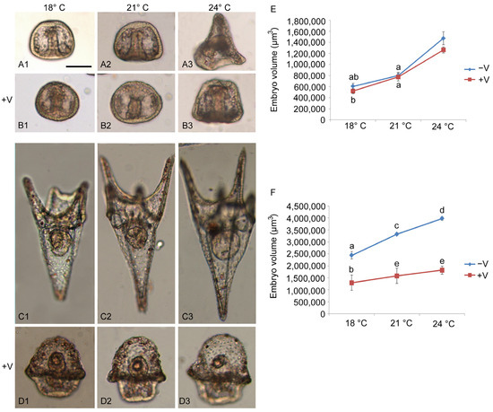 Morphological and morphometric analysis of P. lividus embryos. Images representative of embryos and larvae at 24 and 48 h of development. Embryos were grown at three different temperatures: 18 °C (A1,B1 and C1,D1), 21 °C (A2,B2 and C2,D2), and 24 °C (A3,B3 and C3,D3) with (B1–B3 and D1–D3) or without V (A1–A3 and C1–C3). Bar: 100 μm. The line graphs (E,F) show data related to the volumetric analysis. Each set of experiments was replicated three times, and the data are reported as mean values with standard deviation (n = 3). Treatments with the same letter do not differ in Tukey HSD results.
