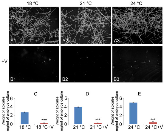 Skeleton analysis. Images show representative fields, captured by light microscope, of purified spicules after 48 h of development from untreated (A1–A3) and V-treated embryos (B1–B3). Embryos were grown at three different temperatures: 18 °C (A1–B1), 21 °C (A2–B2), and 24 °C (A3–B3) in the presence (B1–B3) or absence (A1–A3) of V. Bar: 100 μm. Line graphs (C–E) show data related to average weight spicules, expressed in mg per mL of embryo culture. Each set of experiments was replicated three times, and the data are reported as mean values with standard deviation (n = 3). Statistical analysis was performed using t-tests with *** p ≤ 0.0005.
