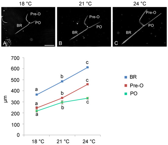 Morphometric evaluation of the length of BR (body rod), PO (post-oral arm), and Pre-O (pre-oral arm). Images of representative spicules purified from control embryos at 48 h of development, observed under light microscopy (20X), from V-untreated embryos (A–C) developed at three different temperatures: 18 °C (A), 21 °C (B), and 24 °C (C). Bar: 100 μm. The line graphs show data related to the average of measurements. Each set of experiments was replicated three times, and the data are reported as mean values with standard deviation (n = 3). Treatments with the same letter do not differ in Tukey HSD results.