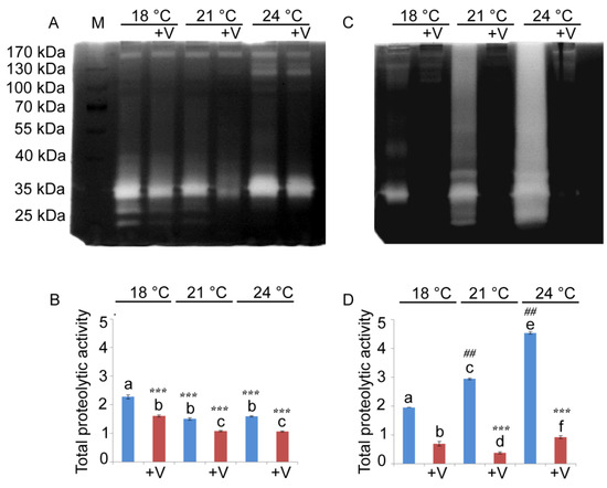 Metal-related enzymatic activities analyzed by gelatin zymography. (A) Zymograms showing bands in lysates of untreated and V-treated embryos grown at 18 °C, 21 °C, and 24 °C for 24 h and (C) 48 h. (B) Line graph reporting the modulation over time of the total proteolytic activity for 24 h and (D) 48 h. Each set of experiments was replicated three times, and the data are reported as mean values with standard deviation (n = 3). (B) *** p < 0.0001 compared with untreated embryos grown at 18 °C. (D) *** p < 0.0001 compared with untreated embryos grown at 18 °C and ## p < 0.005 compared with V-treated embryos grown at 18 °C. The band intensity of panels (A,C) was measured by ImageJ 1.46r image analyzing software. Treatments with the same letter do not differ in Tukey HSD results.