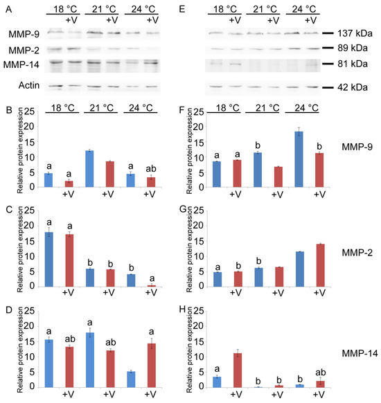We have previously performed a partial biochemical characterization of gelatinases, showing that some of them are members of the MMP family [17]. Given the structural similarities with matrix metalloproteinases and the conservation observed among family members, we performed immunoblotting with antibodies targeting MMP-2, MMP-9, and MMP-14. This investigation sought to evaluate the influence of temperature and V on the activity of these specific metalloproteinases (Figure 5A,E).