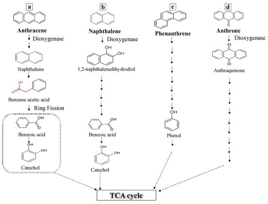 The PAH degradation potential of P. aeruginosa NG4 was evaluated through GC-MS analysis. The metabolites identified from degradation of PAH compounds by P. aeruginosa NG4 at 300 ppm are shown in Table 2. The anthracene degradation released intermediate derivatives such as (i) 2-Amino-1-naphthol, (ii) N-(2,6-dimethylphenyl)-2-ethoxy-5-(tetrazol-1-yl)-benzenesulfonamide, (iii) benzoic acid, and (iv) Catechol. The primarily derivative compounds of anthracene were benzoic acid, naphthalene, and catechol, which are major degradation products, as shown in Figure 2. On the other hand, the derivative compounds observed during naphthalene degradation included: (i) naphthalene, 1,8 Deutero, (ii) catechol, (iii) Naphtho [1,2-c] thiophene, 1,3-dihydro-, 2-oxide, (iv) Naphthalene,1-isocyano, and (v) benzoic acid. The derivative compounds of naphthalene included benzoic acid and catechol. The degradation of naphthalene was dependent on the type of dioxygenase enzyme present in the bacteria. Similarly, Pseudomonas spp. are known to possess dioxygenase enzymes that degrade naphthalene and convert it into 1,2-naphthalenedihydrodiol. The latter is further metabolized to produce benzoic acid, which in turn converts to catechol and is subsequently mineralized by entering the TCA cycle. Similarly, the degradation compounds of phenanthrene included (i) 2,4-Di-tert-butylphenol and (ii) Tris (2,4-di-tert-butylphenyl) phosphite. As mentioned earlier, through the same degradation pathways, phenanthrene is converted into phenol and enters the TCA cycle (Figure 2). The degradation products detected from anthraquinone were (i) N-(2,6-dimethylphenyl)-2-ethoxy-5(tetrazol-1-yl)-benzenesulfonic acid and (ii) 2-Bromo-N-[(1-(cyclohexylmethyl)-1H-1,2,3-triazol-4-yl) methyl]-N-methylbenzenesulfonic acid. It has been reported earlier that, by Sphingomonas sp., anthraquinone is first converted into 1-amino-4-bromoanthraquinone-2-sulfonic acid, undergoes hydrolyzation, and forms two compounds, i.e., 2-amino-3-hydroxy-5-bromobenzenesulfonic acid and 2-amino-4-hydroxy-5-bromo- benzenesulfonic acid []. As compared to the previous study, this study identified benzenesulfonic acid as the major degraded metabolite of anthraquinone by P. aeruginosa NG4. Meanwhile, (i) anthraquinone and (ii) 1,4-Anthraquinone were obtained as the major degradation products of anthrone.