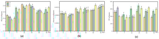 Soil enzyme activity and soil microbial population at different time points were detected using both the BioTek MicroplateReader and the spread plate method. Each time point had three replicates. The mean and standard error (SE) were calculated from the data obtained from these replicates. ANOVA combined with Duncan’s test was used to determine the significance of the differences between the samples at each time point; different letters indicate significant differences (p < 0.05). Statistical analysis was performed using SPSS 26, and the figures were created using OriginLab 2021.