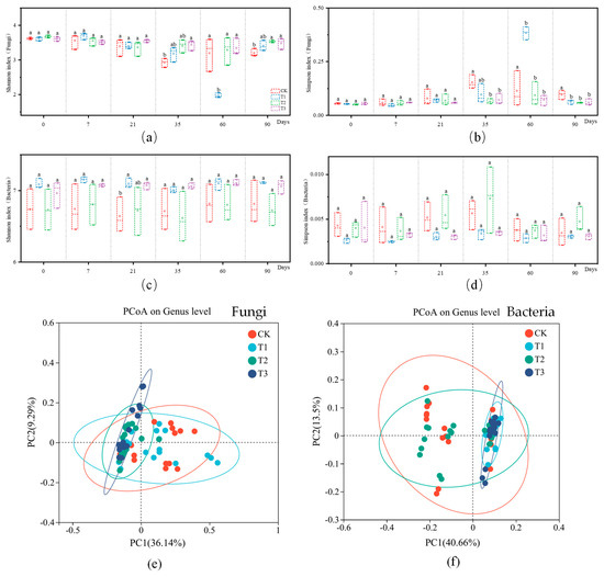 Alpha diversity indicators (Shannon index and Simpson index) and PCoA analysis were used to compare changes in fungal and bacterial diversity over time under different soil treatments. (a) Fungal diversity analysis (Shannon index). (b) Fungal diversity analysis (Simpson index). (c) Bacterial diversity analysis (Shannon index). (d) Bacterial diversity analysis (Simpson index). (e) Fungal PCoA analysis. (f) Bacterial PCoA analysis. Note: (a–d): Biological diversity analysis was based on Shannon and Simpson metrics using high-throughput sequencing results obtained in 2.5, with three replicates for each time point, graphically plotted using Origin 2021. (e–f): Characterization of microbial community composition changes was based on principal component analysis (PCoA) using Bray–Curtis distance and the results of high-throughput sequencing performed in 2.5.
